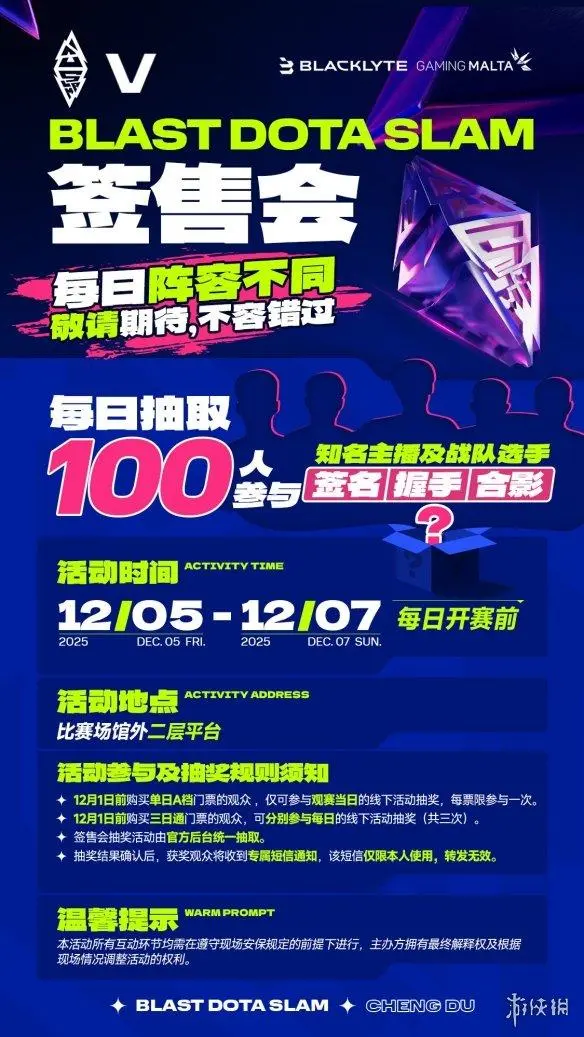 赛事期间还将举办特别签售会活动,12月5日至7日每天抽取100名幸运观众与知名主播及选手互动。成都与BLAST签署了三年战略合作协议,凤凰山体育公园将作为正赛场地,这座可容纳1.8万人的专业场馆将为全球观众提供优质观赛体验。
