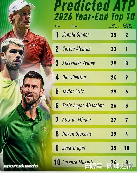 国际网球媒体发布2026赛季年终TOP10预测榜单。现任世界第一阿尔卡拉斯与第二辛纳位置互换,德约科维奇预测将跌至第八位。美国选手谢尔顿有望从第九位升至第五。